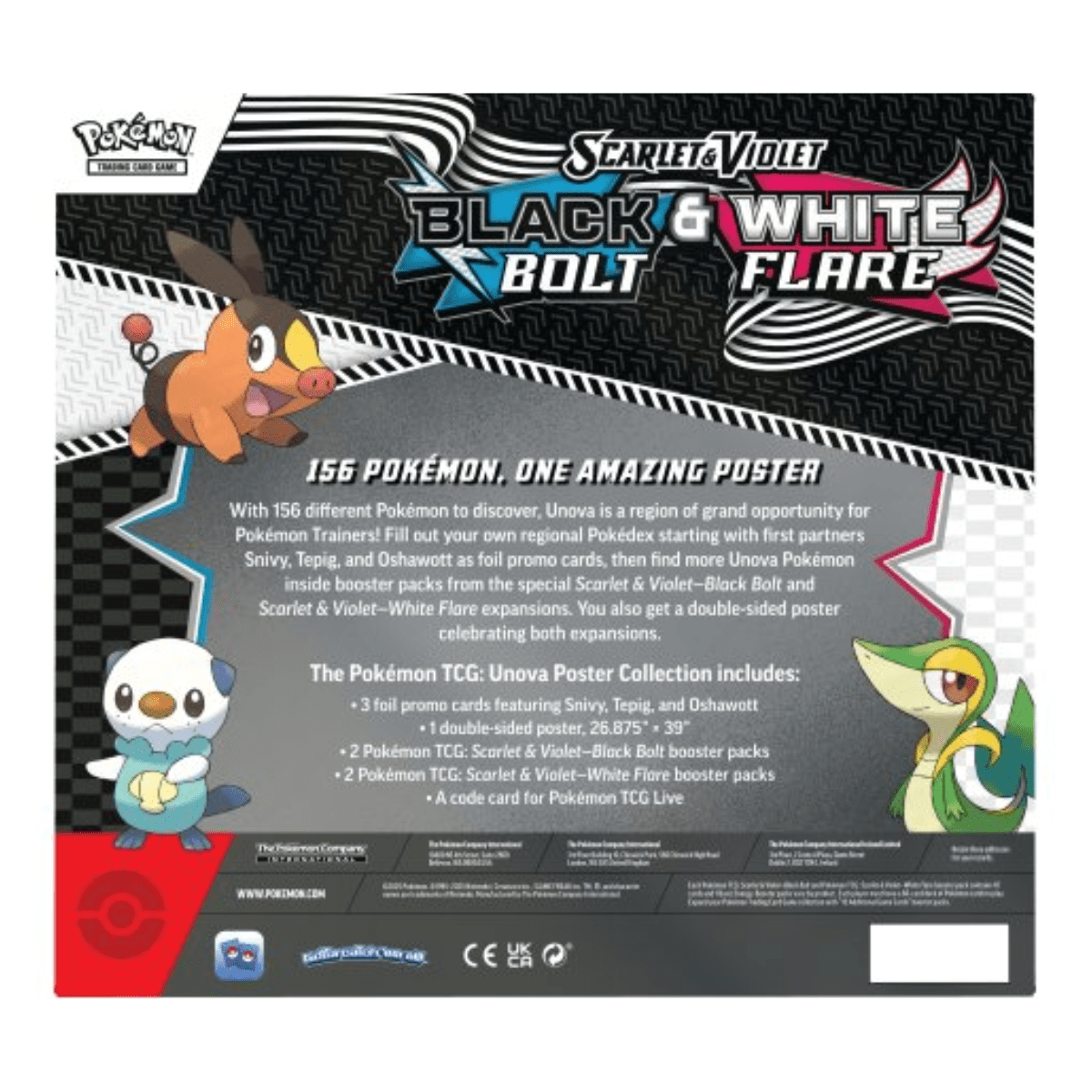 Stap binnen in de wereld van vuur en bliksem met de Pokémon – Black Bolt and White Flare Poster Collection! Deze unieke collector’s set is een visueel spektakel voor elke Pokémon-fan, met schitterende posters én 3 exclusieve foil promokaarten van Snivy, Tepig en Oshawott, de geliefde starter-Pokémon uit de Unova-regio.