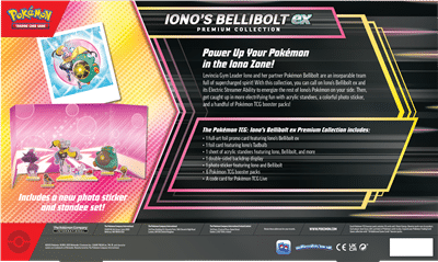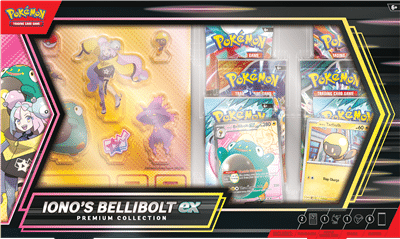 Iono’s Bellibolt ex Premium Collection brengt de energie van Levincia rechtstreeks naar je collectie. Je krijgt exclusieve foil promo kaarten, zes booster packs en leuke display items zoals acryl figuren en een backdrop. Ideaal als cadeau, om te openen, of om netjes sealed te bewaren.