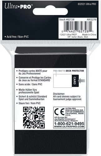 De Ultra Pro – Matte Black Deck Protectors zijn de ideale keuze voor wie op zoek is naar professionele bescherming voor standaard kaarten (66×91 mm). Deze zwarte sleeves hebben een non-glare Pro Matte afwerking, die vervelende reflecties vermindert en zorgt voor een soepelere speelervaring. Dankzij de matte afwerking zijn de kaarten makkelijker te schudden en te hanteren, wat ze perfect maakt voor competitief spel.